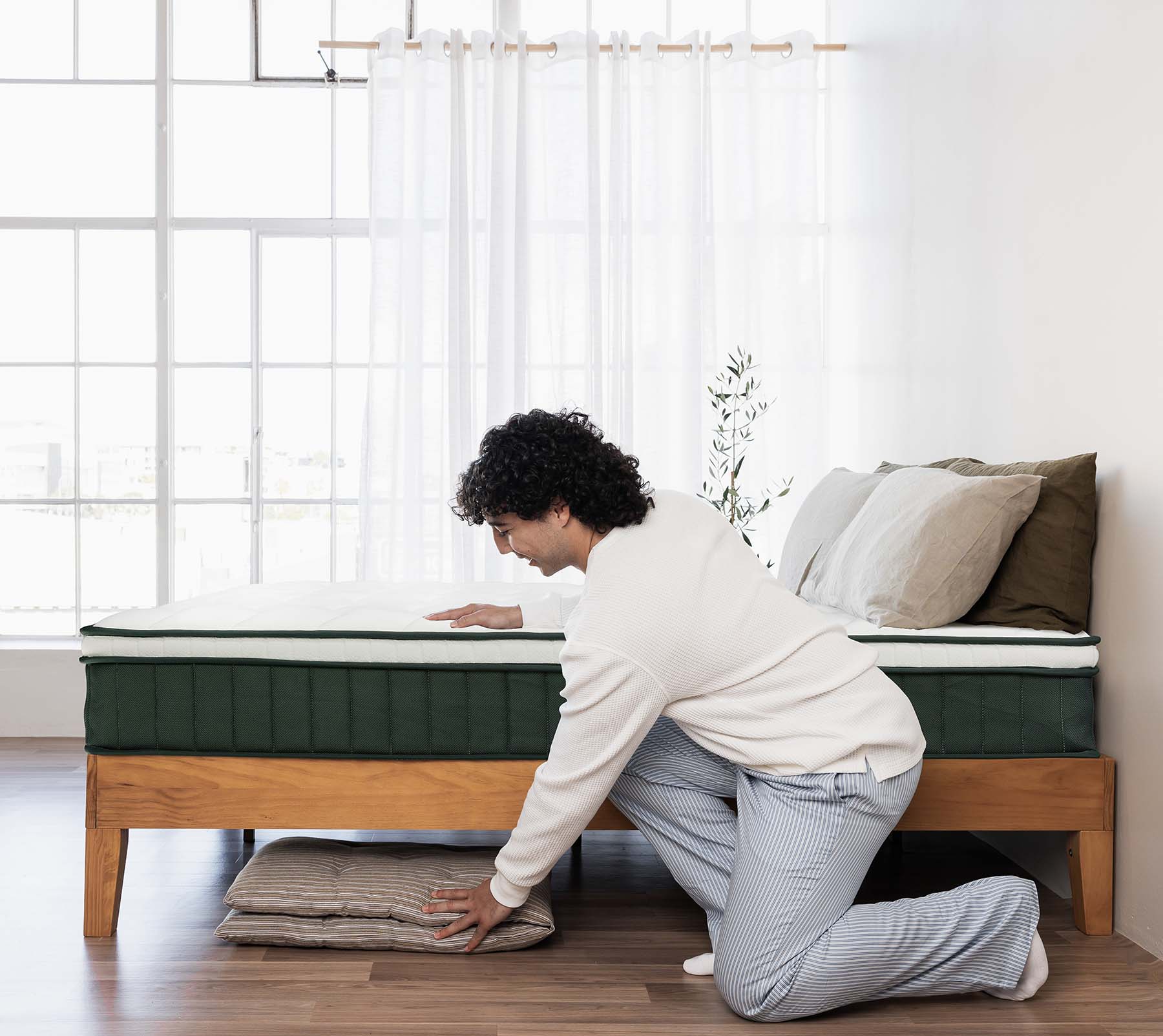 The mattress + bed frame arrives at your door conveniently in a box! Our innovative packaging is significantly smaller than traditional mattresses, merging vacuum packing and a rolled design. This allows for easy movement upstairs, round tricky corners or through smaller door frames.